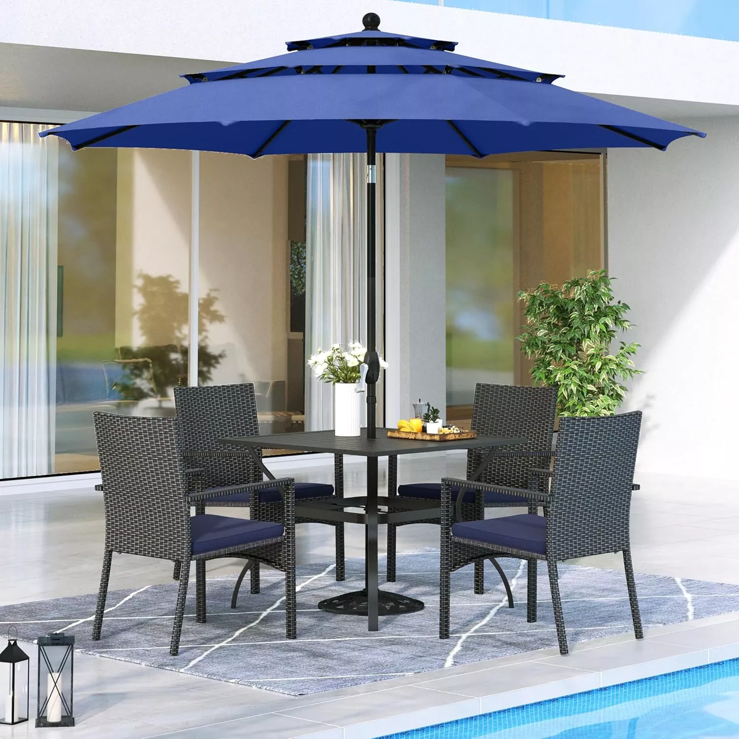 - Extra-Large 10-ft Umbrella: Made with fade-resistant polyester fabric, this umbrella offers UV protection and water resistance. The 3-tier vented top promotes airflow and helps reduce heat buildup. A convenient crank and tilt mechanism allows easy adjustment for the perfect amount of shade. (Umbrella base not included.)