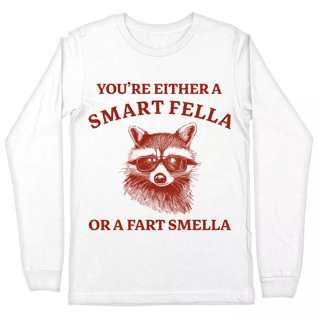 Are You A Smart Fella Or Fart Smella Long Sleeve T-Shirt is proudly made with 7x less water than average manufacturers, in recycle-friendly facilities that also guarantee zero sweatshop conditions. Raccoon Meme T-Shirt is designed and printed in California.