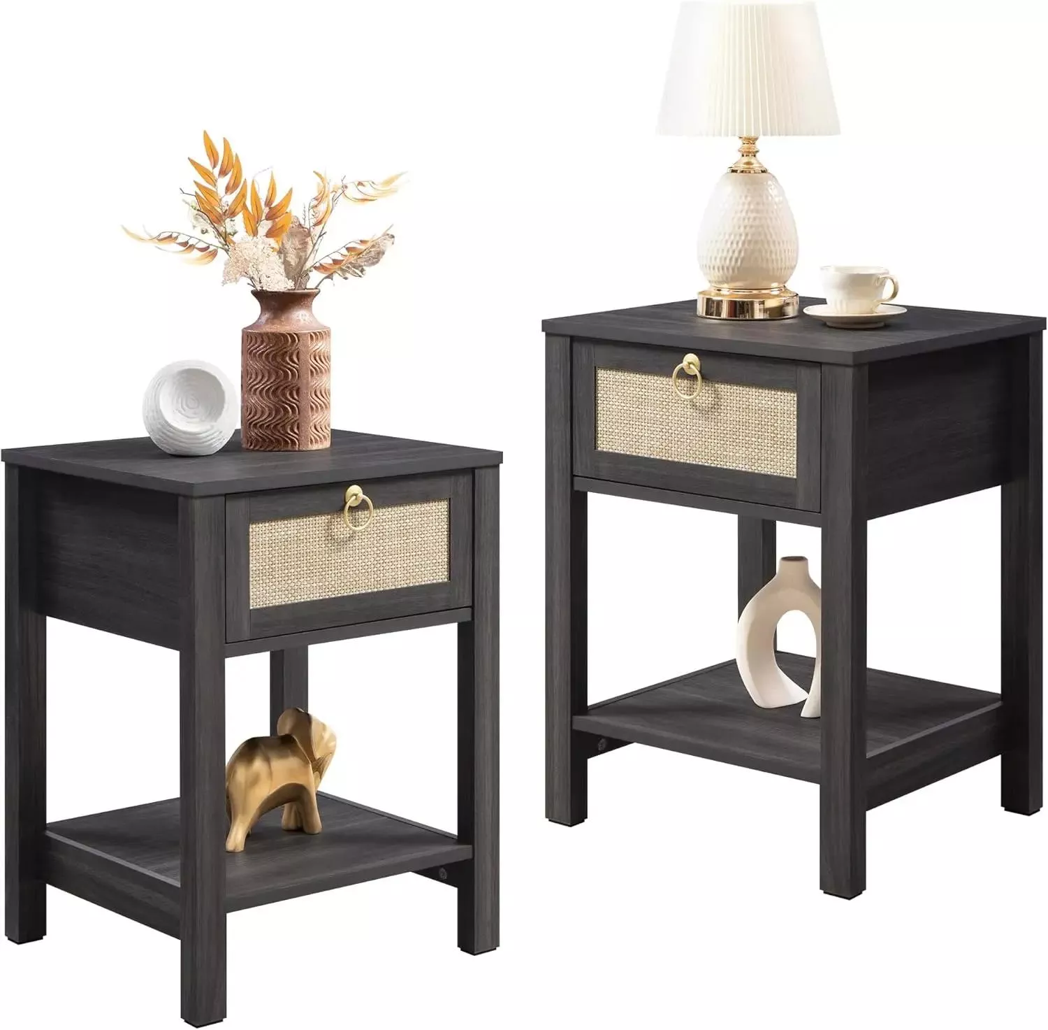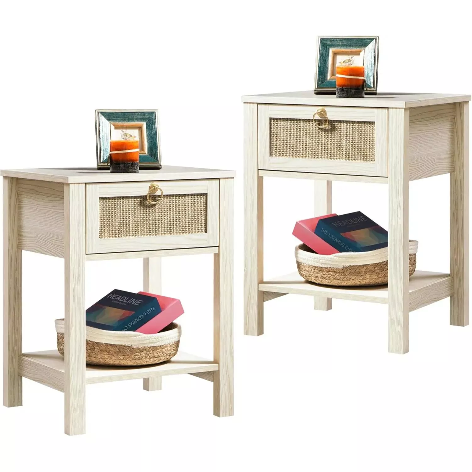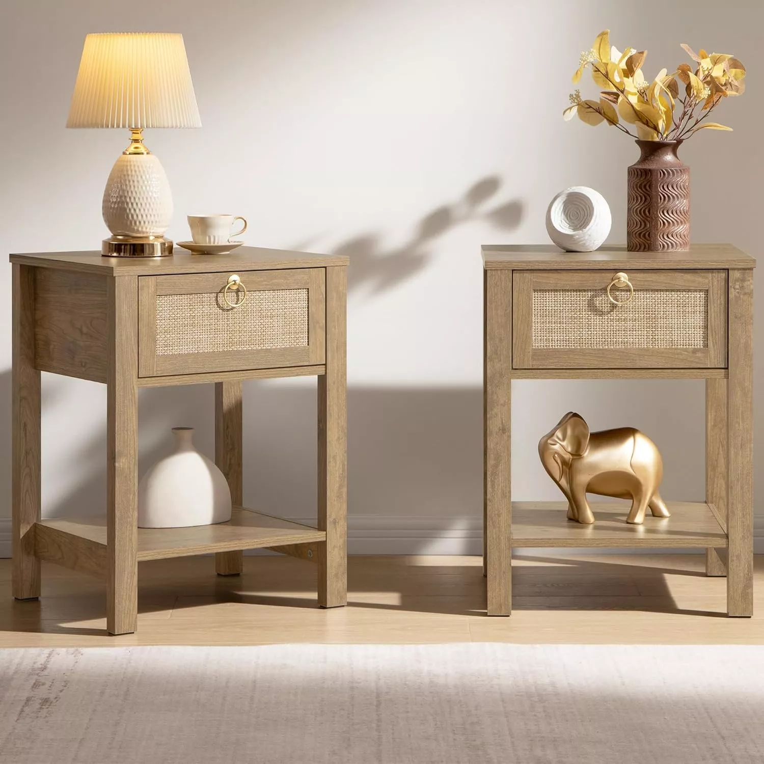 Measuring 17.7″ wide, 15.2″ deep, and 23.6″ high, this compact yet spacious side table features a deep rattan drawer with golden brass knobs for a refined finish, along with an open lower shelf ideal for books, baskets, or decorative items. The surface is roomy enough for your favorite lamp, reading glasses, and a cup of tea, keeping your essentials within reach while elevating your décor.