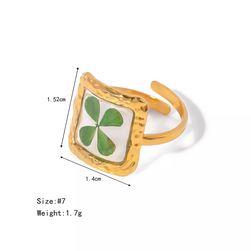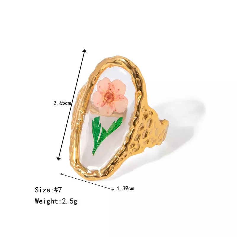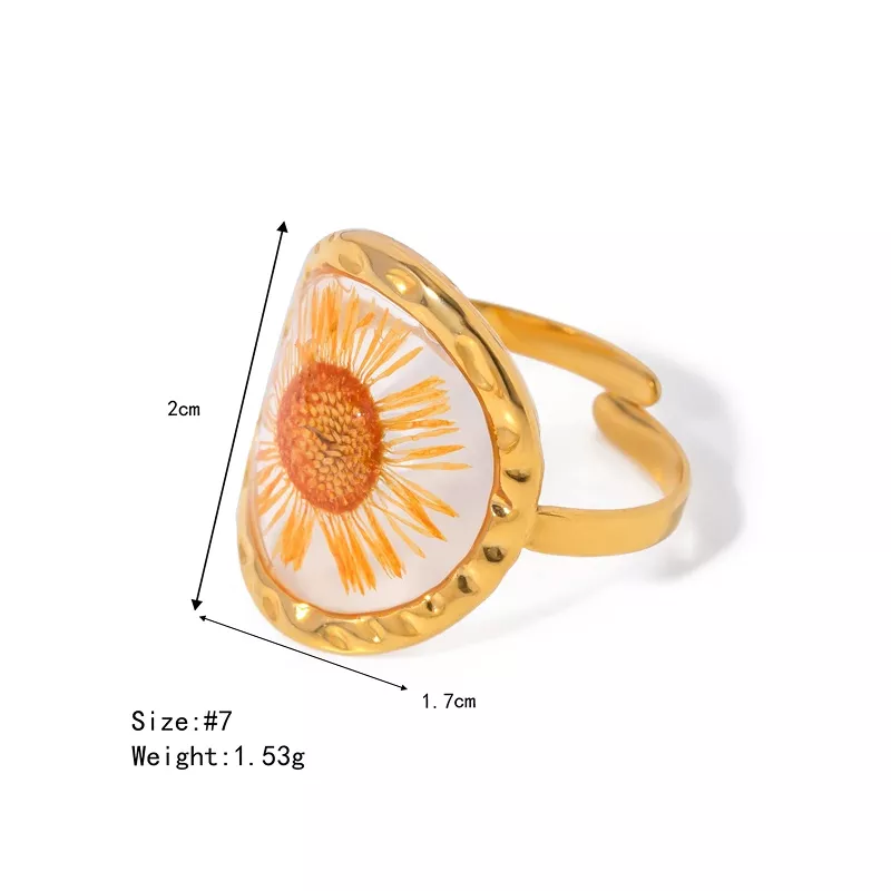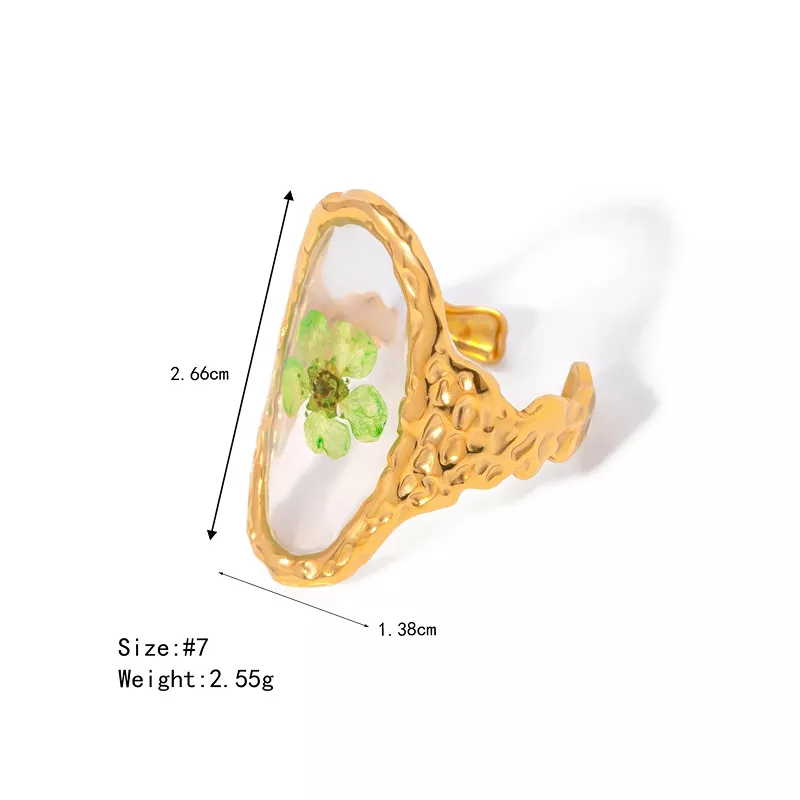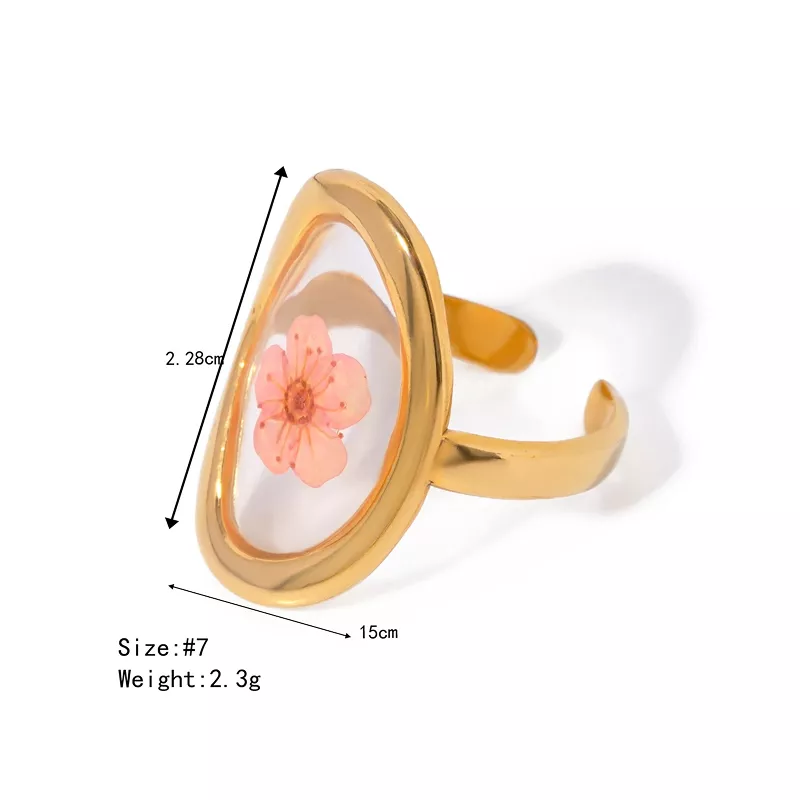 Elevate your jewelry collection with this exquisite 18K gold-plated polygonal dry flower ring. Designed for women who appreciate elegance and individuality, this statement piece merges modern minimalist style with the delicate beauty of nature. Featuring a unique geometric design infused with real dried flowers, this ring adds a charming and artistic touch to any outfit.