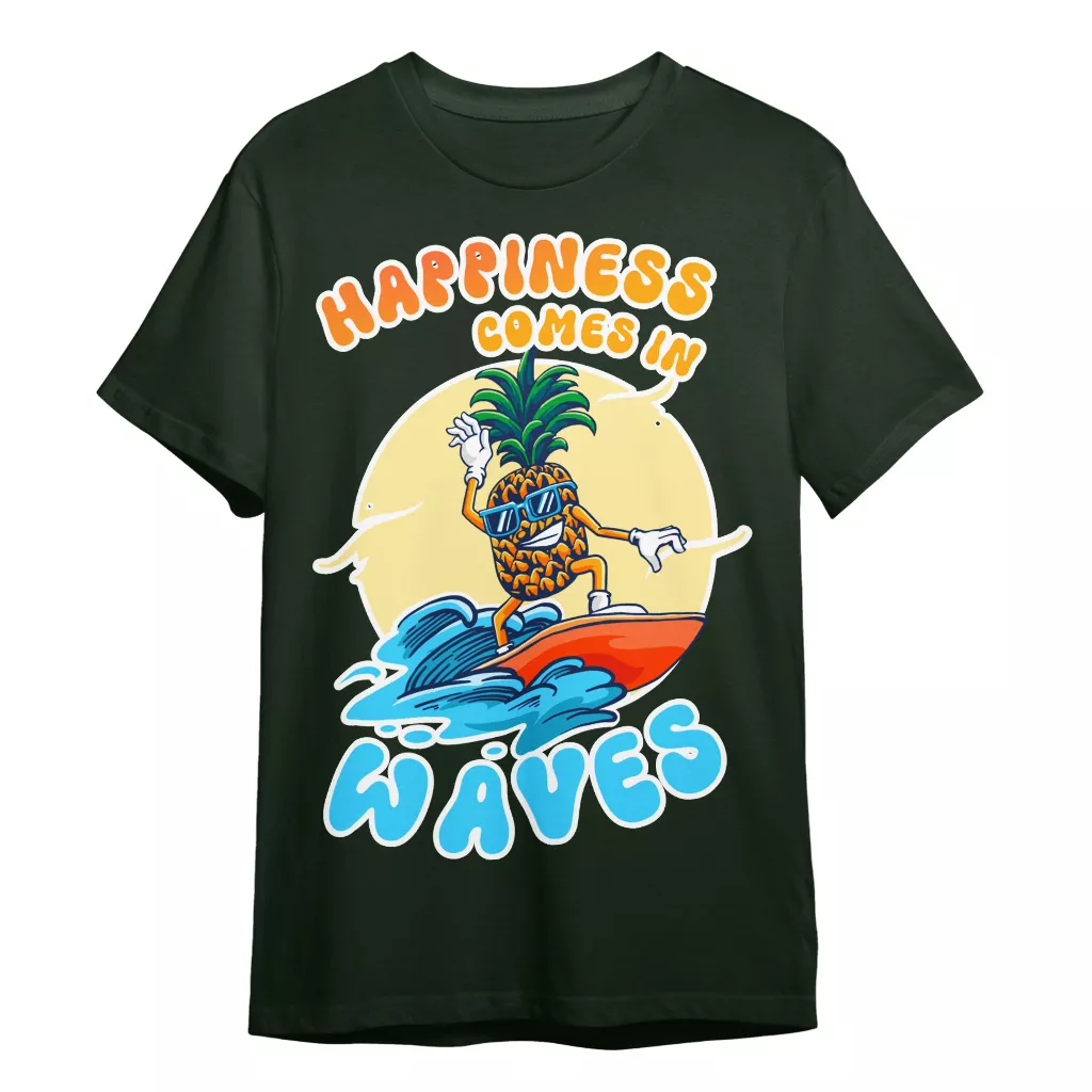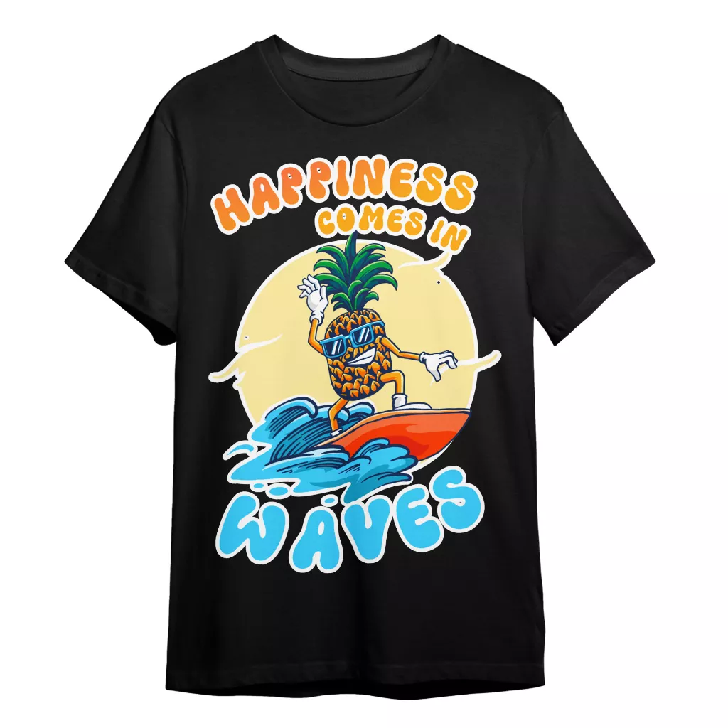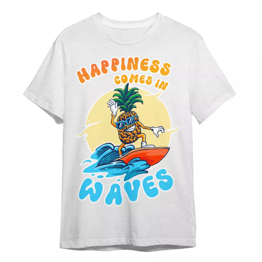 Happiness Comes In Waves T-Shirt is no ordinary piece of clothing. Its taped neck and shoulders, double-needle sleeve and bottom hems, and quarter-turned construction provide a retail fit for clothing that’s true to size. Surfing Pineapple Heavy Cotton Tee is Designed and printed in California.