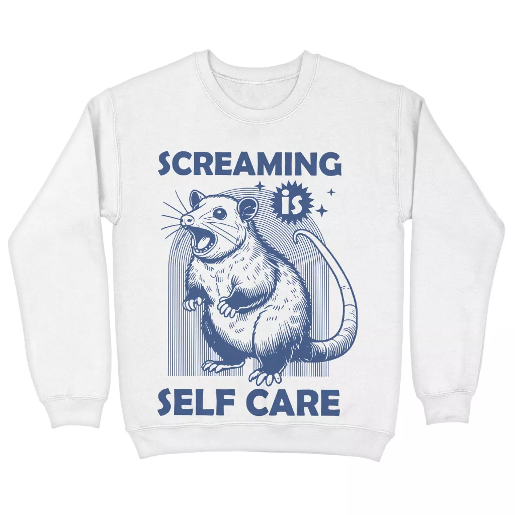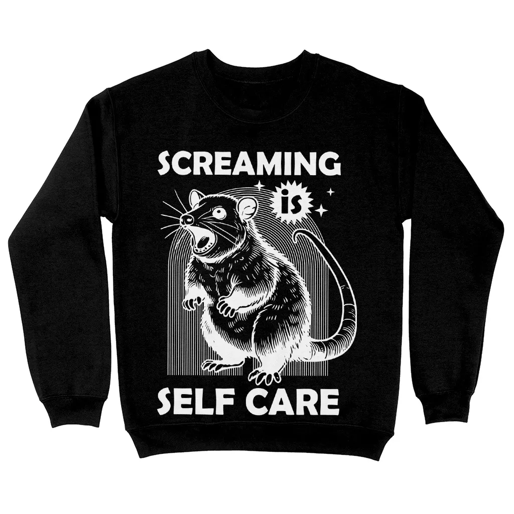 Screaming Is Self Care Sweatshirt is made from a 50% U.S. Cotton/50% Polyester blend, this warm 8.0 oz sq/yd classic fit style looks great and makes a great canvas for decorating. Screaming Is Self Care Sweatshirt is designed and printed in California.