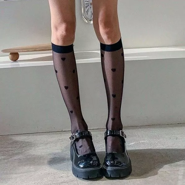 Elevate your style game with our Sheer Love Knee Socks, a mesmerizing blend of sophistication and allure. Crafted from luxurious nylon, these stockings boast a delicate see-through design adorned with charming love heart patterns, adding a touch of romance to any outfit.